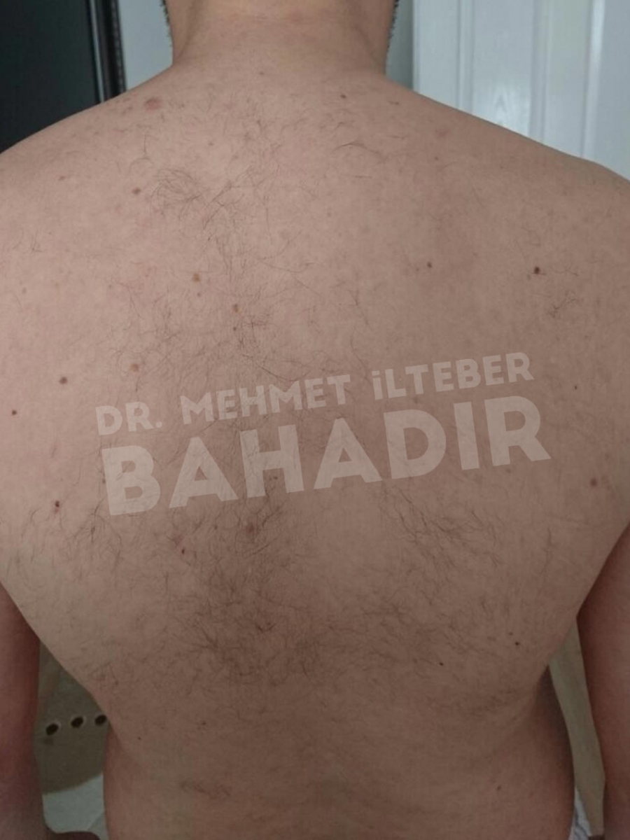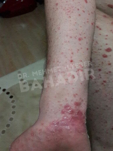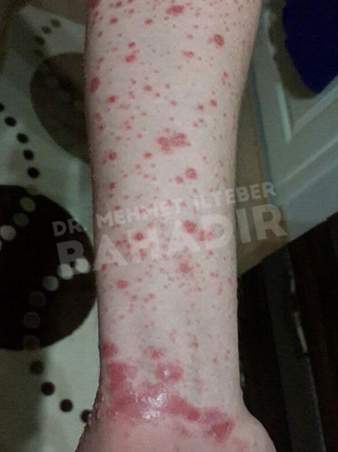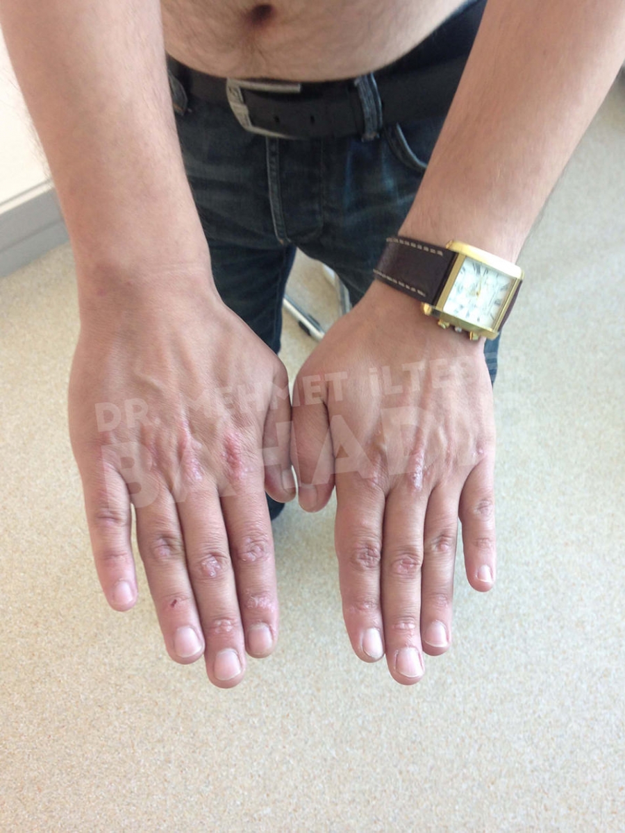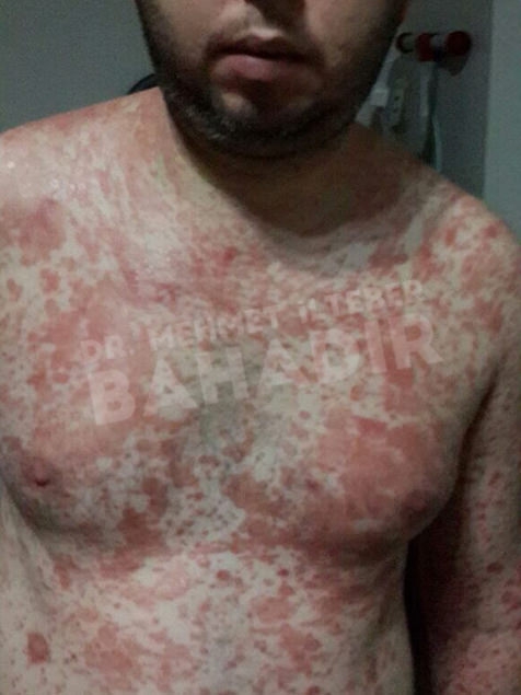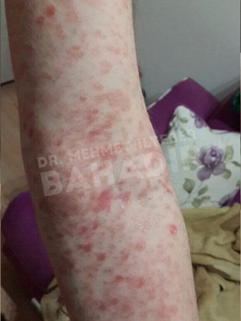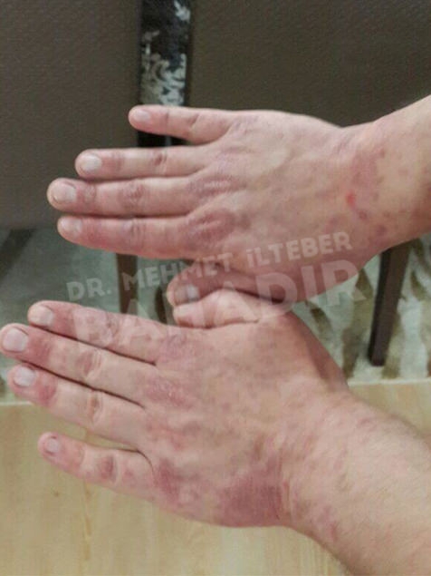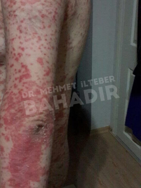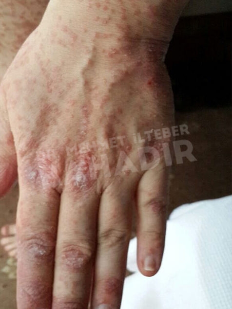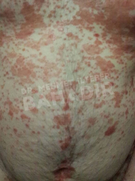 ماردين ، مريضة عمرها 19 عامًا. تم تشخيص المريض بالصدفية منذ 4 سنوات وبدأ العلاج في مشفى Cerrahpasa. لم يستطع المريض الحصول على نتائج كافية من العلاج. عندما جاء المريض إلينا ، كانت قد قصت شعرها بسبب الآفات الموجودة في رأسها. أخبرنا المريض أنه يريد أن يعالج. كان المريض يعاني من آفات واسعة في عمق الشعر ، بين الصدر والرقبة والظهر والذراعين والساقين. تم إعطاء المريض مدة علاج 3.5 شهر. أثناء العلاج ، كان جلد المريض سليما. آفات فروة الرأس تتحسن بسرعة. لا توجد آفة في جسم المريض. يطبق Mehmet Ilteber العناية بالبشرة الموصى بها من Bahadir.